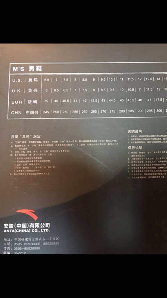 こちらは少し前に手に入れた361°のBOXの後ろに記載されているサイズチャートの写真なんですが、何かお気づきになりませんか?